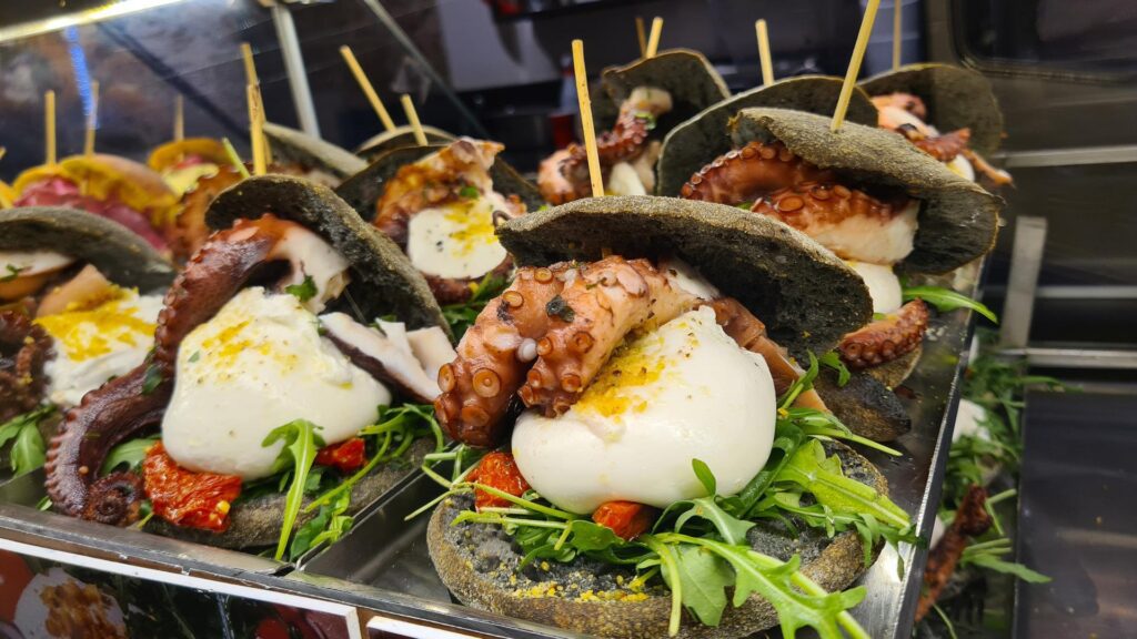 Był czas, że Instagram zalała fala zdjęć tej bułki. W różnych okolicznościach przyrody prezentowała się pięknie. Pierwszy raz ja spróbowałam zachęcona właśnie takimi malowniczymi ujęciami i przepadłam. Ośmiornica tutaj jest lokalnym specjałem i umieją ją przyrządzać. A z dodatkiem stracciatelli, cime di rapa (jeśli ktoś lubi) i w towarzystwie chrupiącej bułeczki staje się przekąską, za którą będziesz tęsknić długo.