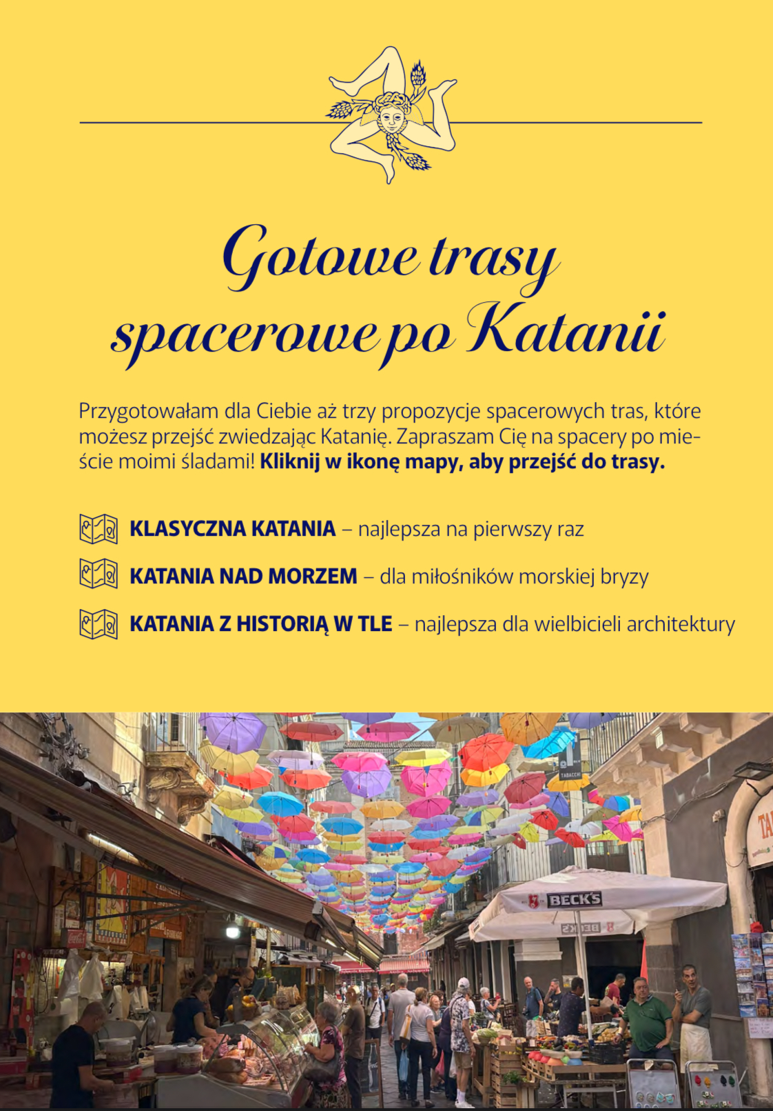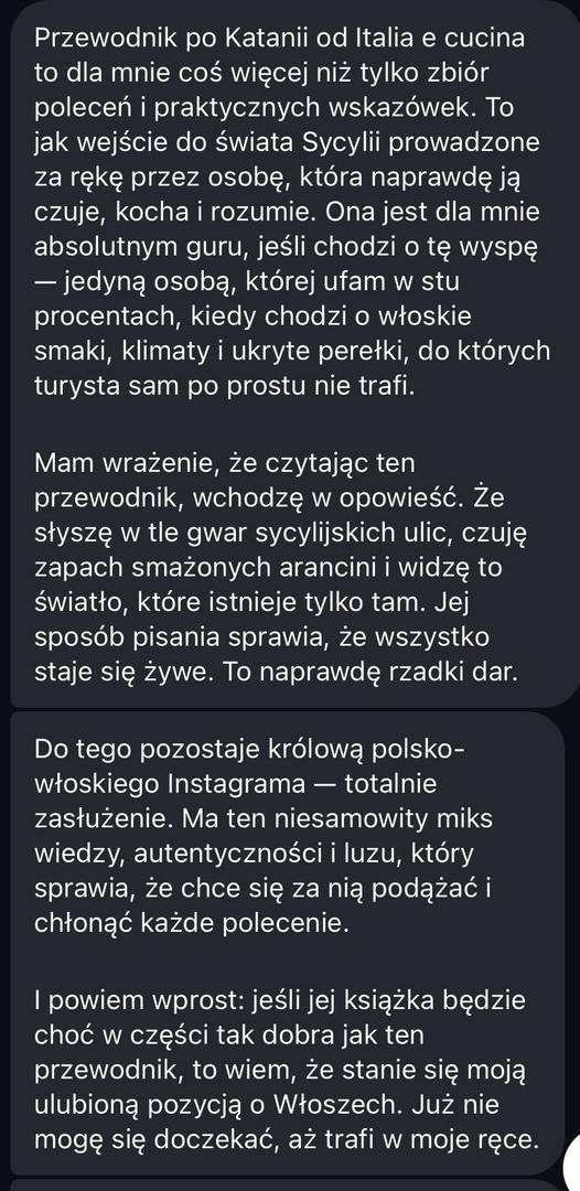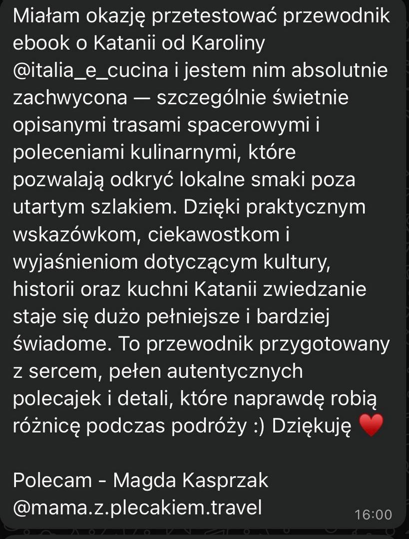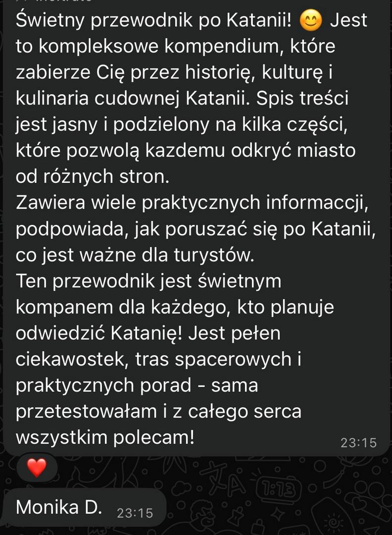 Ten e-book to coś więcej niż zwykły przewodnik po Katanii. To osobista opowieść o mieście, jego zabytkach i smakach. Jeśli szukasz nie tylko listy zabytków, ale klucza do zrozumienia Katanii – jesteś we właściwym miejscu. Ten przewodnik po Katanii pomoże Ci odkryć miasto, które jest trudne, a jednocześnie fascynujące. Miasto, które odbudowywało się aż 7 razy w swojej długiej historii i gdzie codzienność do łatwych nie należy. A jednocześnie, gdzie ludzie uśmiechają się do siebie i znajdują radość w codziennych i prostych przyjemnościach.