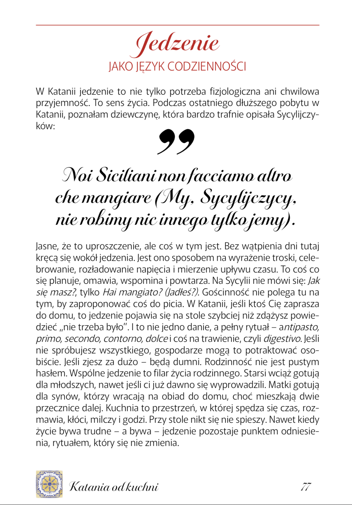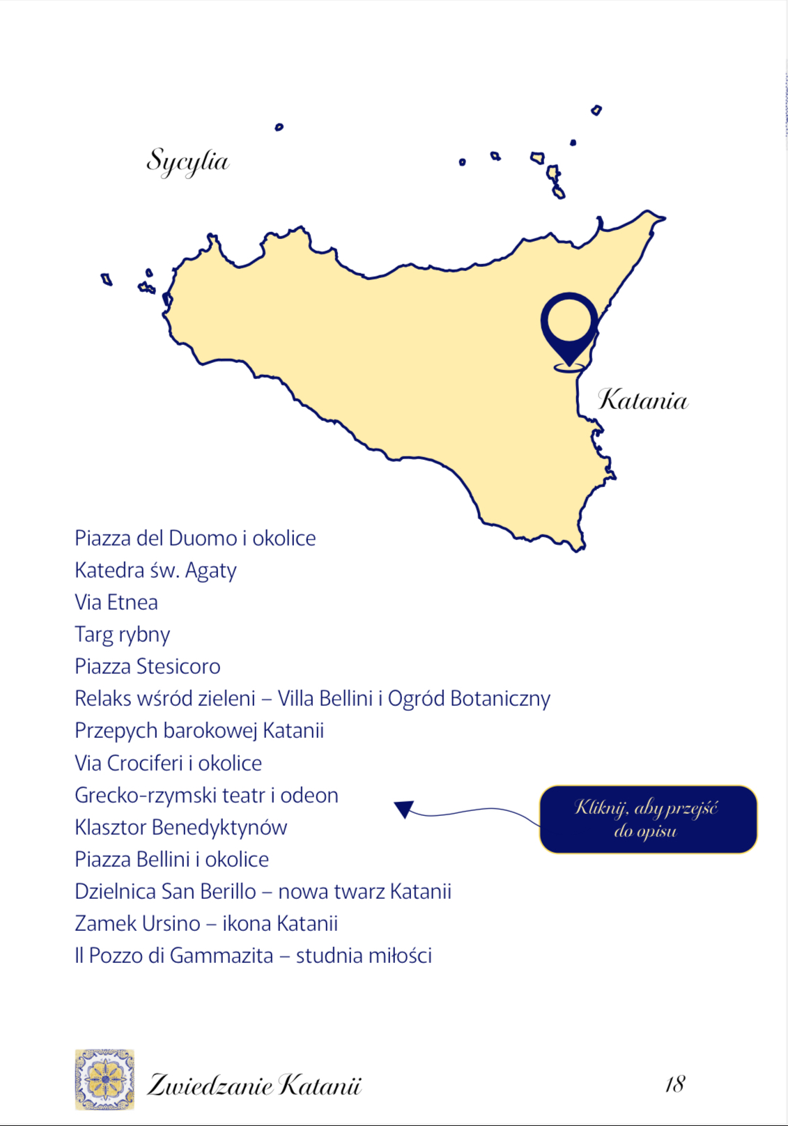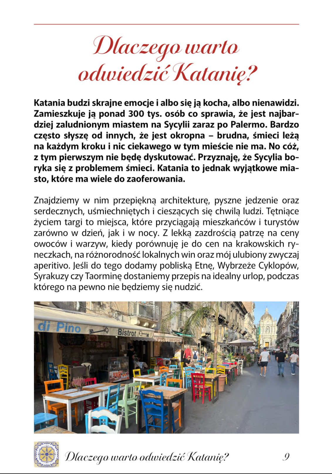 Ten e-book to coś więcej niż zwykły przewodnik po Katanii. To osobista opowieść o mieście, jego zabytkach i smakach. Jeśli szukasz nie tylko listy zabytków, ale klucza do zrozumienia Katanii – jesteś we właściwym miejscu. Ten przewodnik po Katanii pomoże Ci odkryć miasto, które jest trudne, a jednocześnie fascynujące. Miasto, które odbudowywało się aż 7 razy w swojej długiej historii i gdzie codzienność do łatwych nie należy. A jednocześnie, gdzie ludzie uśmiechają się do siebie i znajdują radość w codziennych i prostych przyjemnościach.